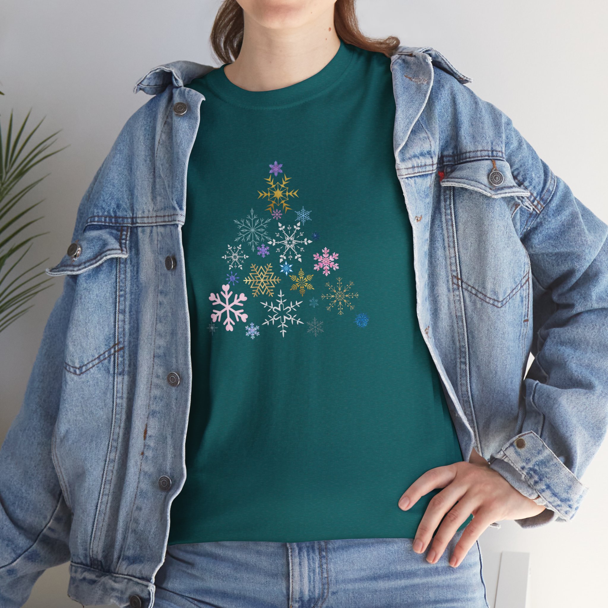 Festive and fun Christmas tree snowflake T-shirt, perfect for the holiday season. This colorful design brings a cheerful vibe and can be worn for Christmas celebrations and winter gatherings. Relevant to adults looking for a comfortable and stylish option for the festive period.