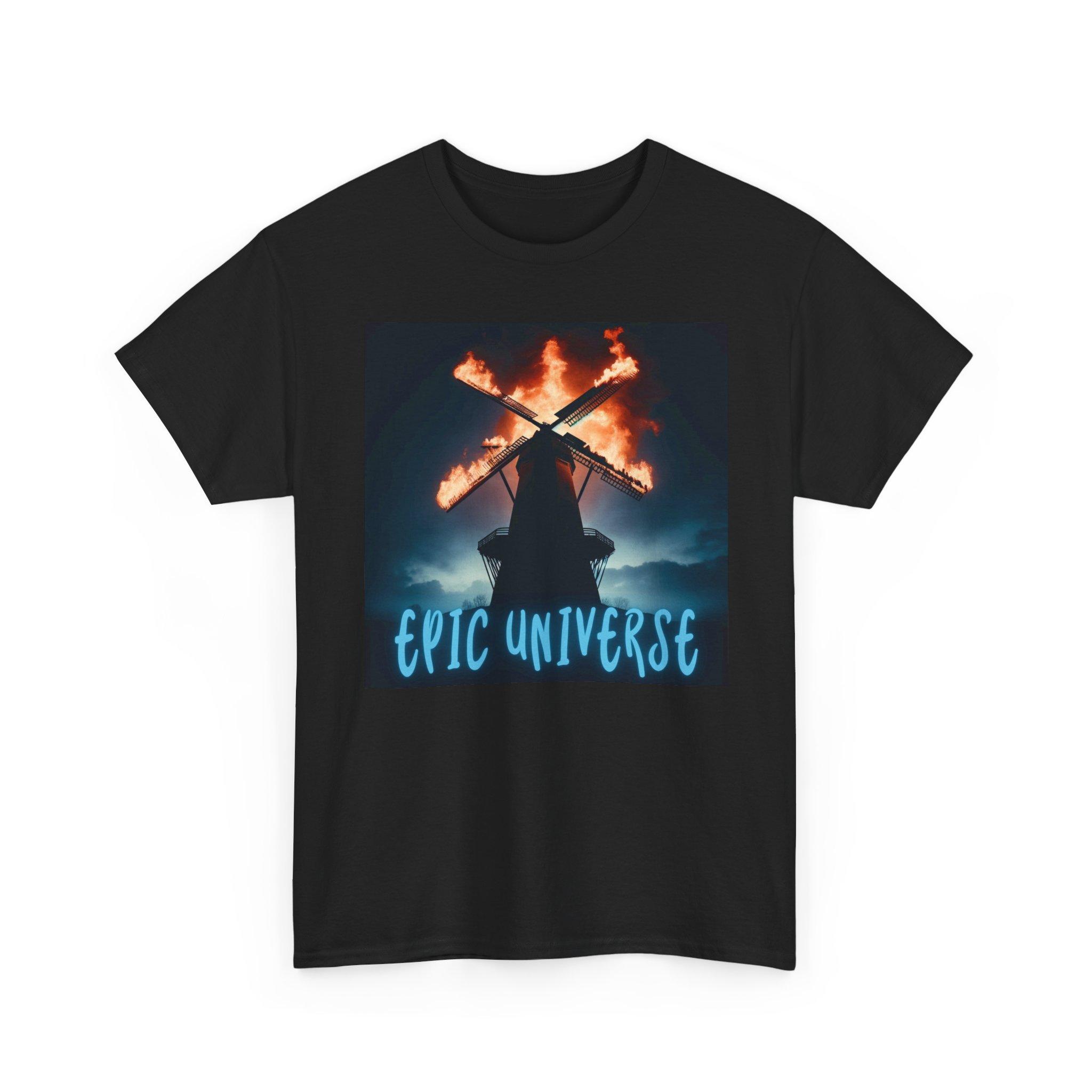 This Epic Universe inspired T-Shirt features a windmill design for the upcoming Burning Blade Tavern. Perfect for fans of Epic Universe and fantasy-themed apparel, this T-Shirt offers a casual and stylish look that can be worn for everyday occasions. Ideal for those looking for a unique and eye-catching tee to wear during theme park visits, conventions, or casual outings.