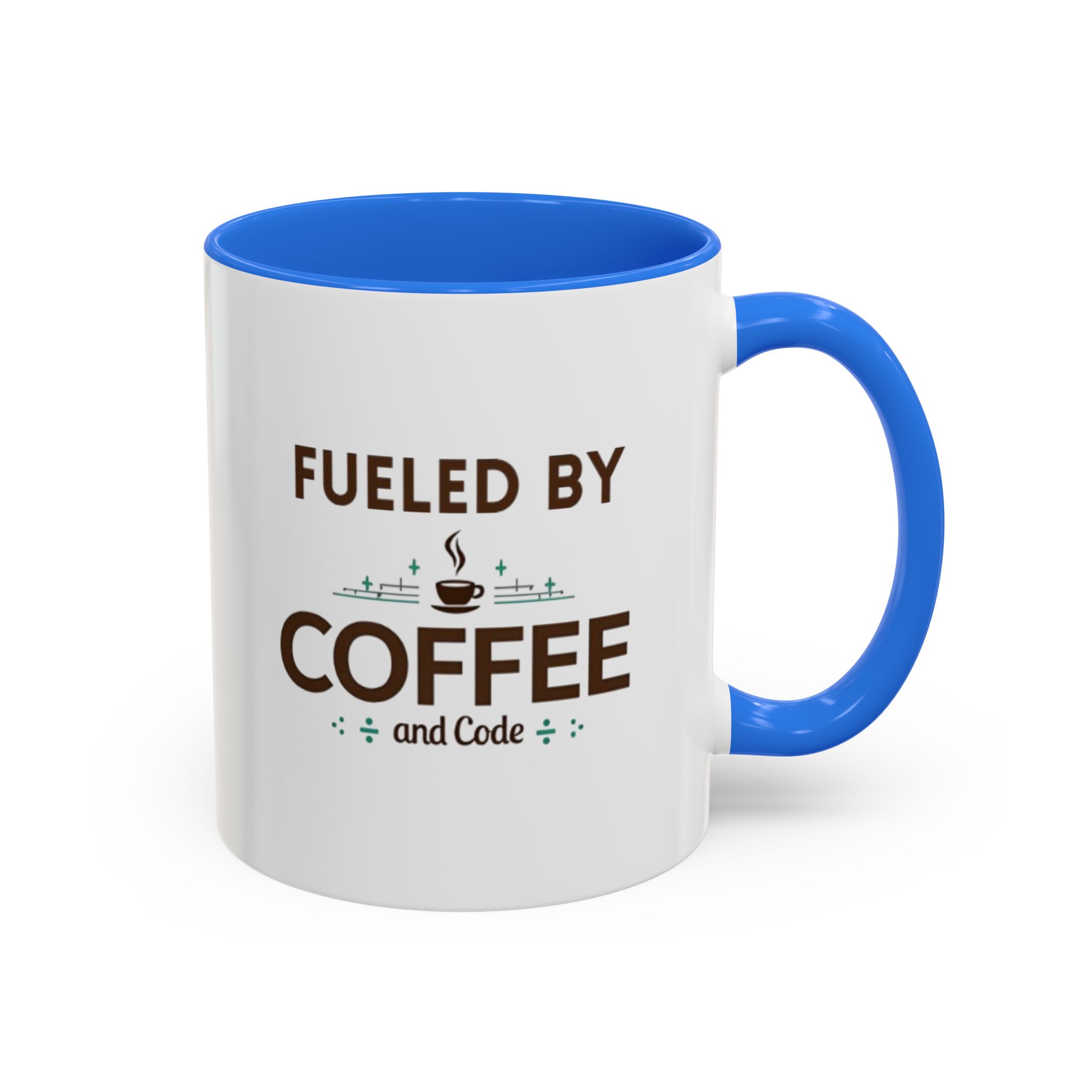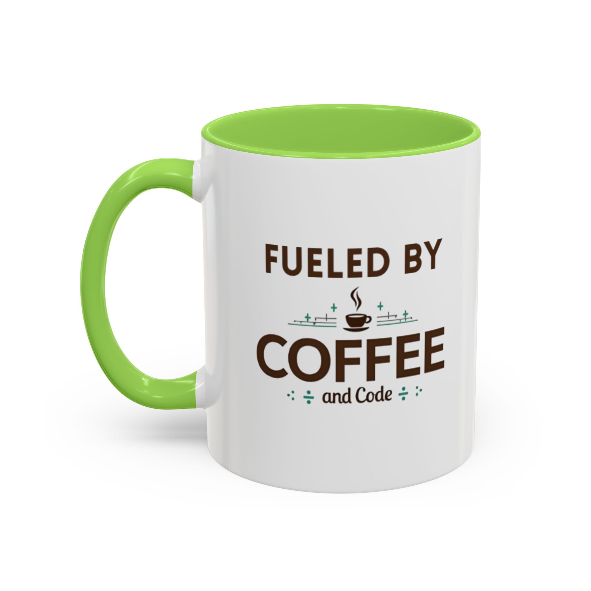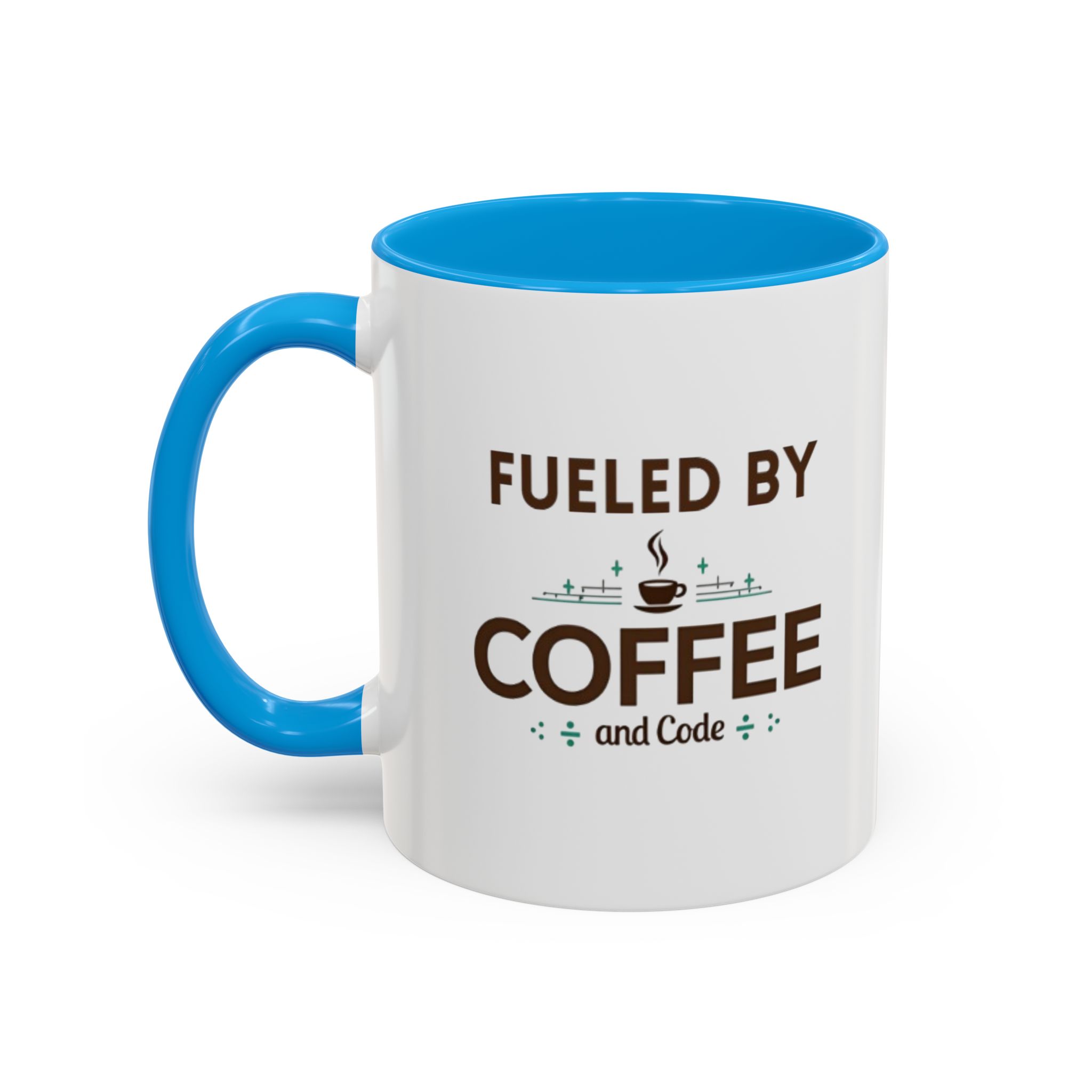Fueled by Coffee and Code mug, fun colors, programmer humor, funny coffee cup
