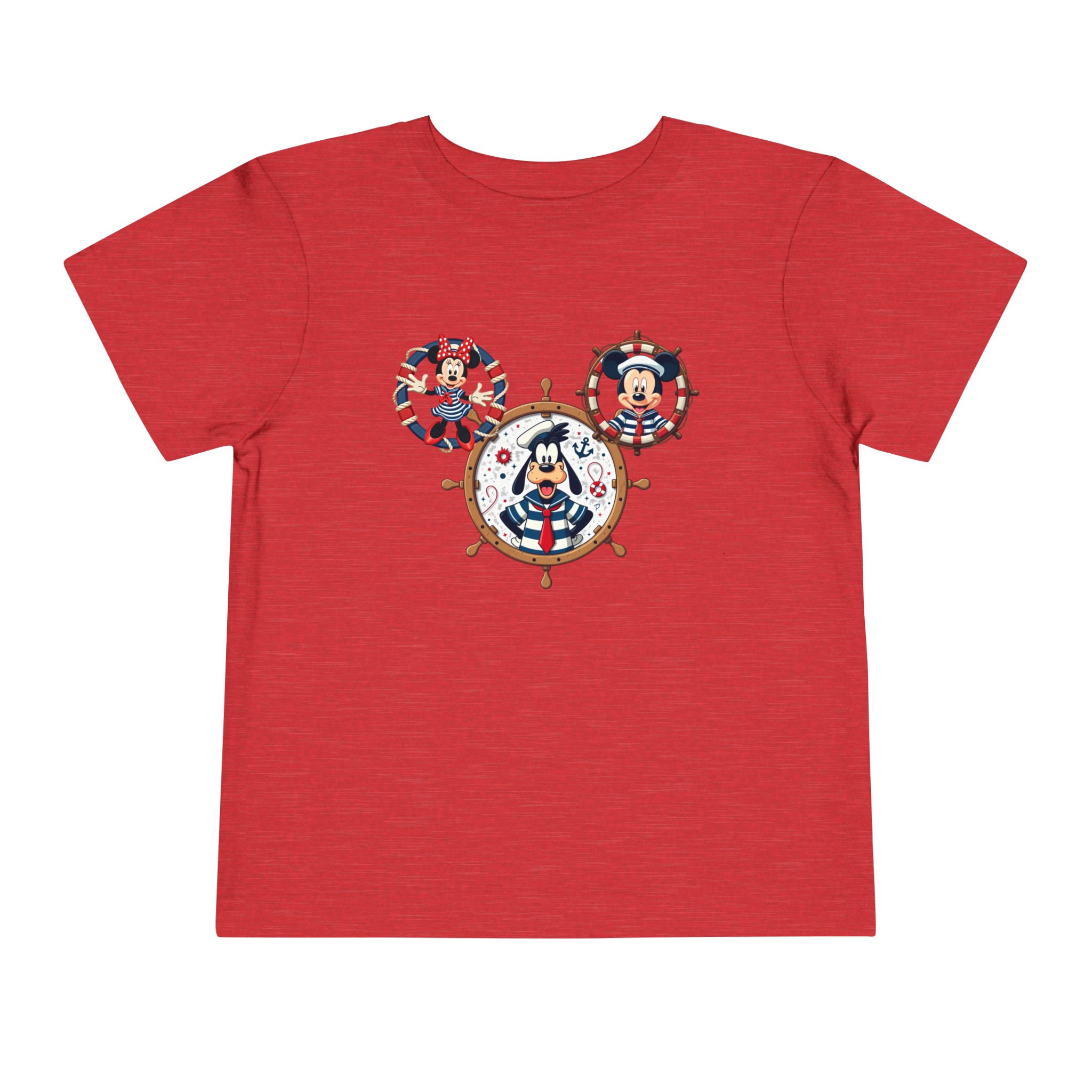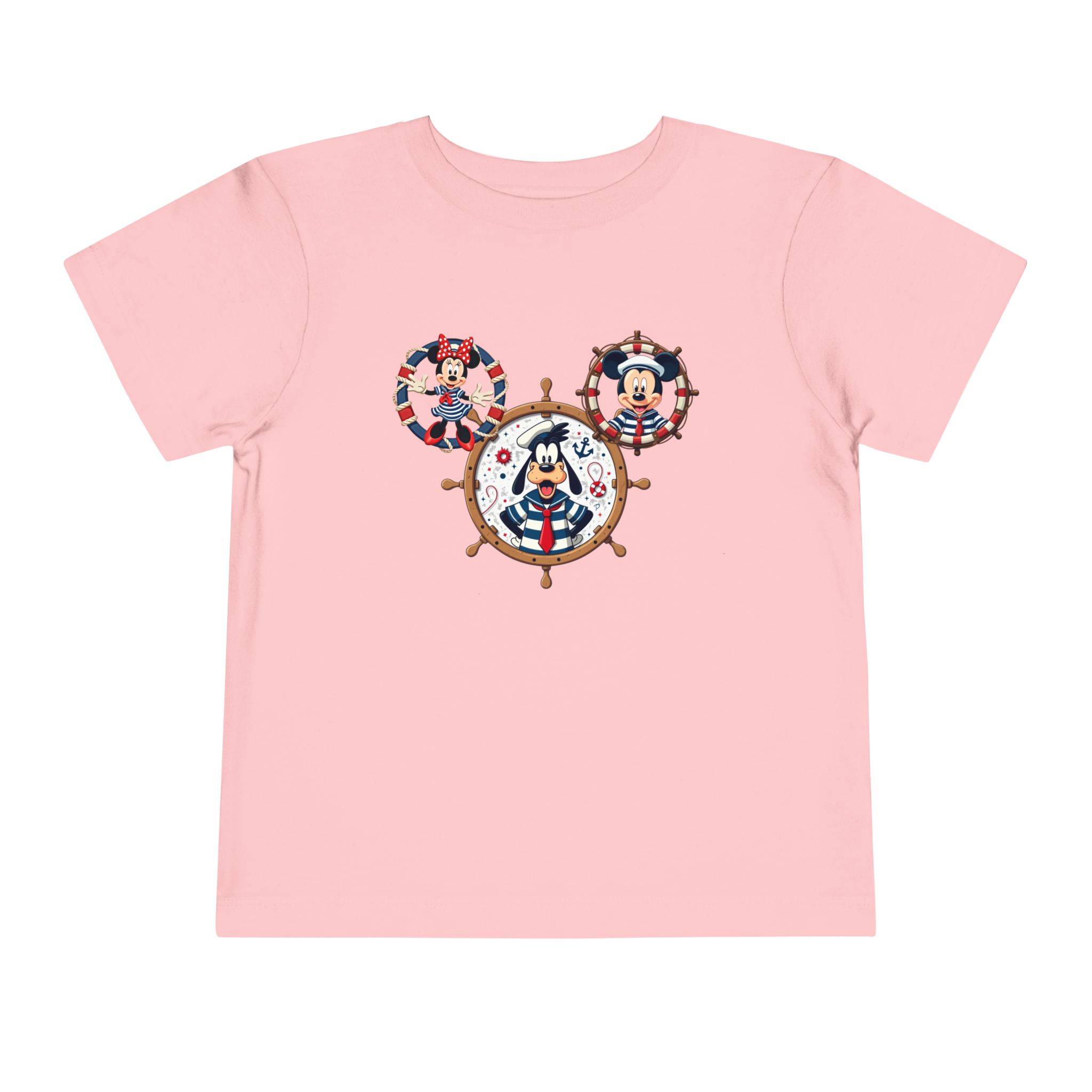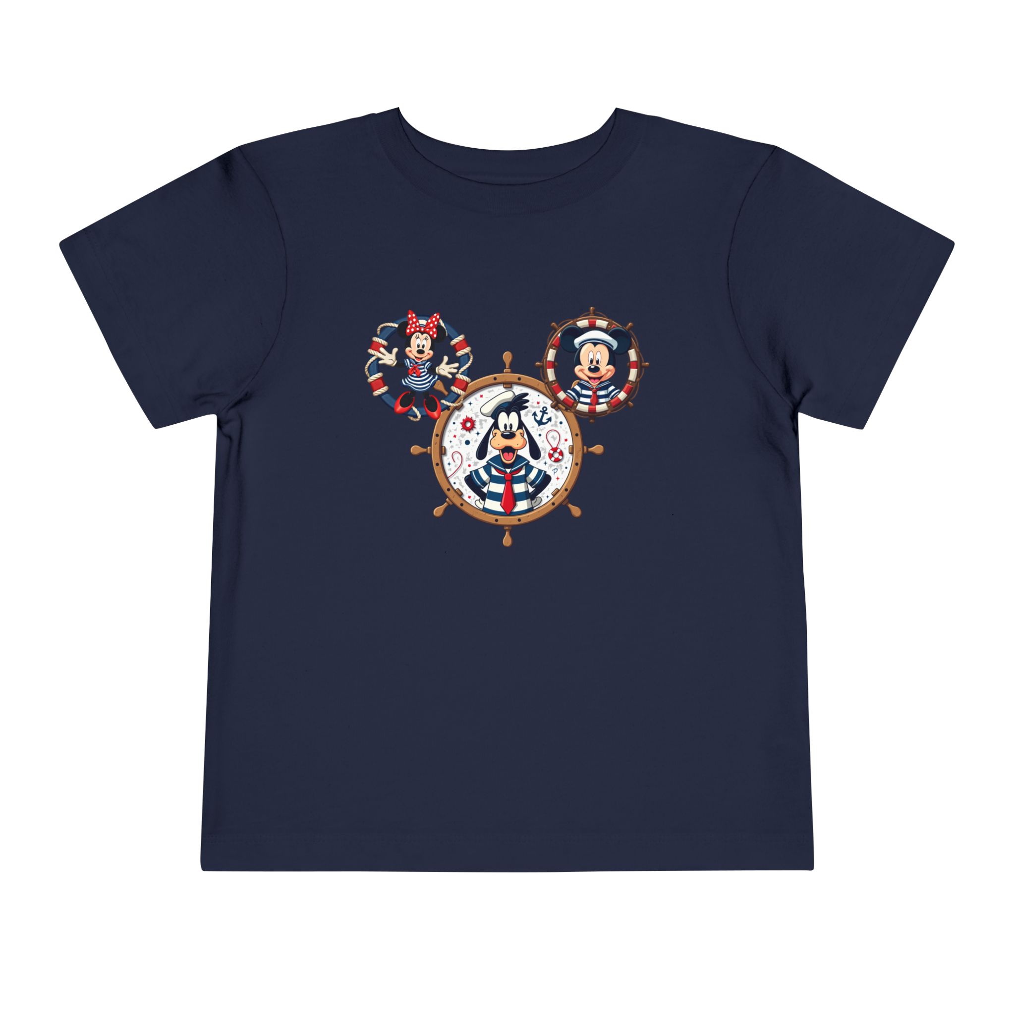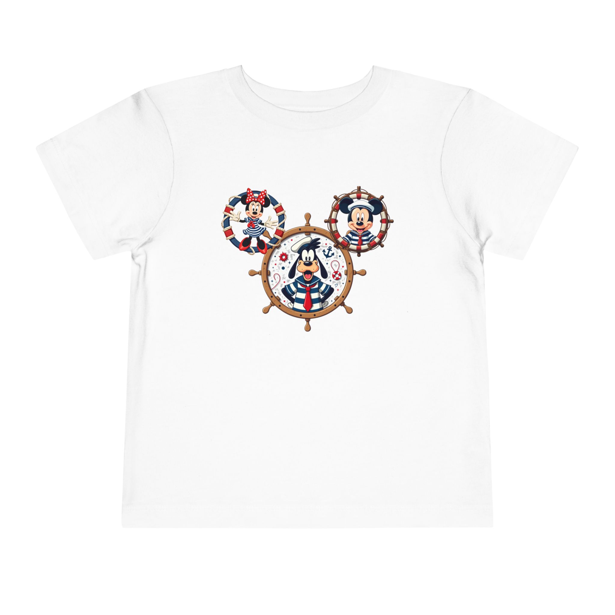 Hidden Mickey Nautical Toddler Tee, perfect for a Disney Cruise, Park visit or for the kid that loves Mickey, Minnie and Goofy. It exudes a playful and fun vibe, making it a great addition to a young Disney fan’s wardrobe. Ideal for toddlers who enjoy Disney characters and themed outings.